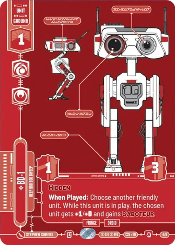 When Played: Choose another friendly unit. While this unit is in play, the chosen unit gets +1/+0 and gains Saboteur.