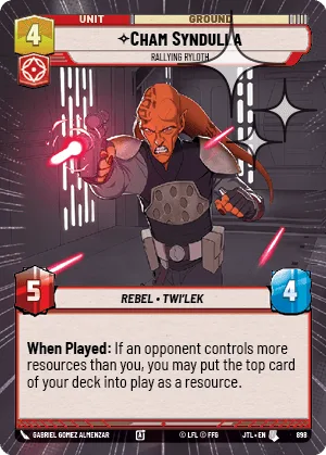When Played: If an opponent controls more resources than you, you may put the top card of your deck into play as a resource.