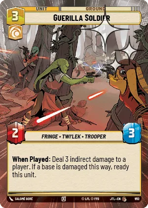 When Played: Deal 3 indirect damage to a player. If a base is damaged this way, ready this unit.