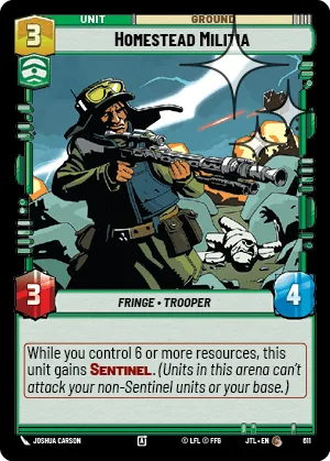 While you control 6 or more resources, this unit gains Sentinel. (Units in this arena can't attack your non-Sentinel units or your base.)
