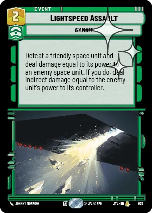 Defeat a friendly space unit and deal damage equal to its power to an enemy space unit. If you do, deal indirect damage equal to the enemy unit's power to its controller.