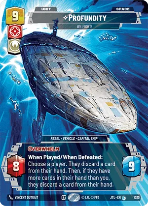 When Played/When Defeated: Choose a player. They discard a card from their hand. Then, if they have more cards in their hand than you, they discard a card from their hand.