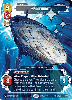 When Played/When Defeated: Choose a player. They discard a card from their hand. Then, if they have more cards in their hand than you, they discard a card from their hand.