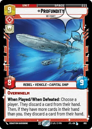When Played/When Defeated: Choose a player. They discard a card from their hand. Then, if they have more cards in their hand than you, they discard a card from their hand.