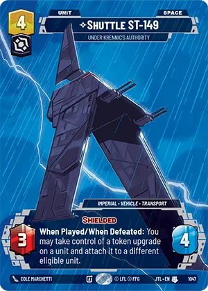When Played/When Defeated: You may take control of a token upgrade on a unit and attach it to a different eligible unit.