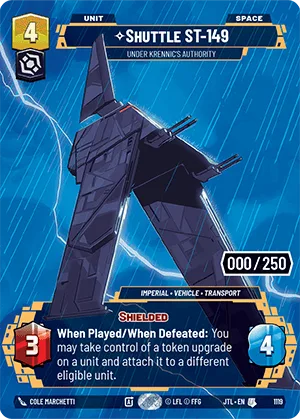 When Played/When Defeated: You may take control of a token upgrade on a unit and attach it to a different eligible unit.