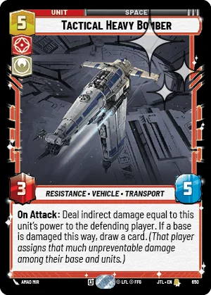 On Attack: Deal indirect damage equal to this unit's power to the defending player. If a base is damaged this way, draw a card. (That player assigns that much unpreventable damage among their base and units.)