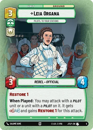 When Played: You may attack with a Pilot unit or a unit with a Pilot on it. It gets +1/+0 and gains Restore 1 for this attack.