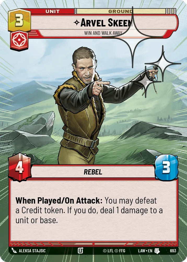 When Played/On Attack: You may defeat a Credit token . If you do, deal 1 damage to a unit or base.