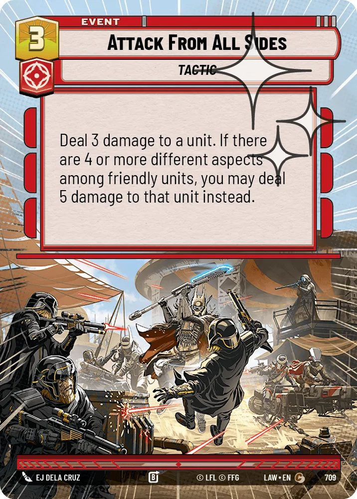 Deal 3 damage to a unit. If there are 4 or more different aspects among friendly units, you may deal 5 damage to that unit instead.