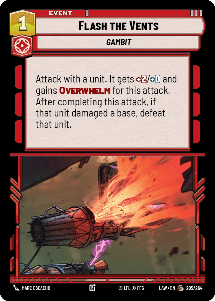 Attack with a unit. It gets +2/+0 and gains Overwhelm for this attack. After completing this attack, if that unit damaged a base, defeat that unit.