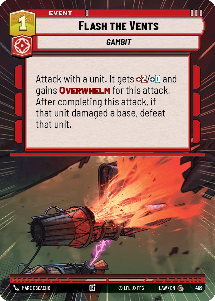 Attack with a unit. It gets +2/+0 and gains Overwhelm for this attack. After completing this attack, if that unit damaged a base, defeat that unit.