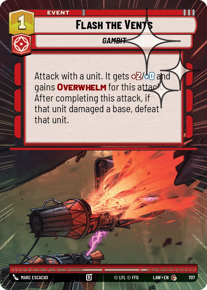 Attack with a unit. It gets +2/+0 and gains Overwhelm for this attack. After completing this attack, if that unit damaged a base, defeat that unit.