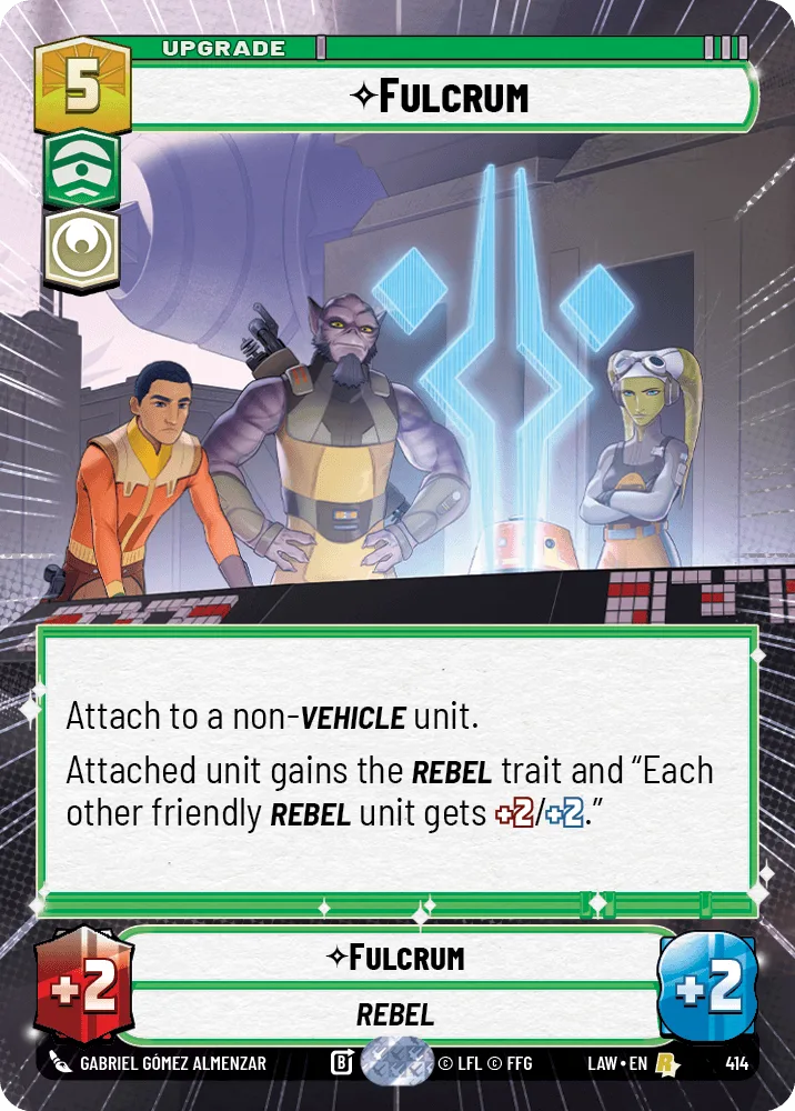 Attached unit gains the Rebel trait and “Each other friendly Rebel unit gets +2/+2.”