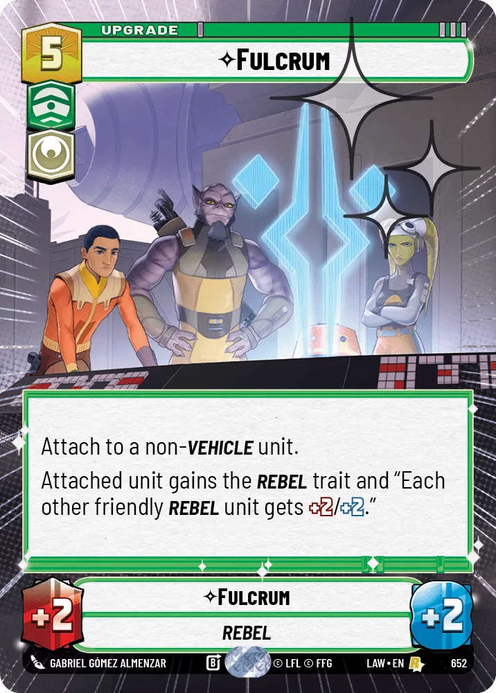 Attached unit gains the Rebel trait and “Each other friendly Rebel unit gets +2/+2.”