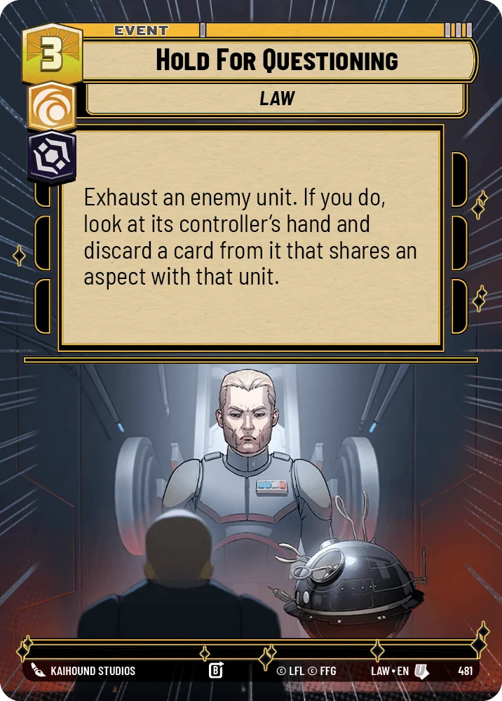 Exhaust an enemy unit. If you do, look at its controller's hand and discard a card from it that shares an aspect with that unit.