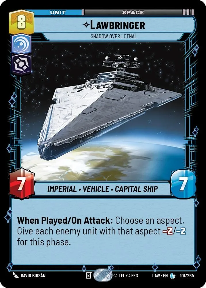 When Played/On Attack: Choose an aspect. Give each enemy unit with that aspect ā2/ā2 for this phase.