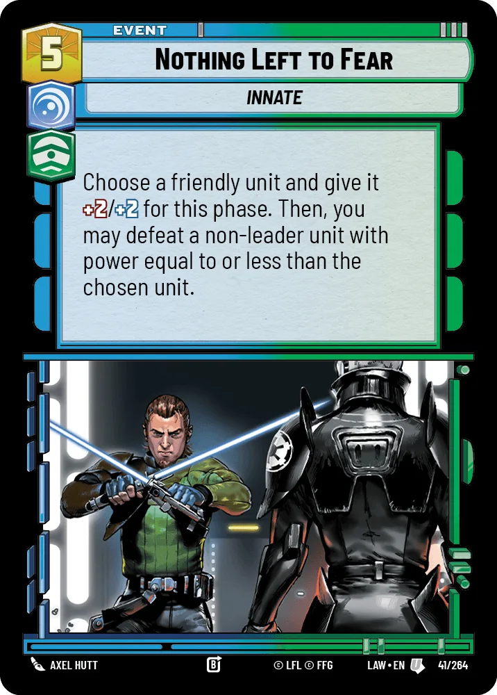 Choose a friendly unit and give it +2/+2 for this phase. Then, you may defeat a non-leader unit with power equal to or less than the chosen unit.