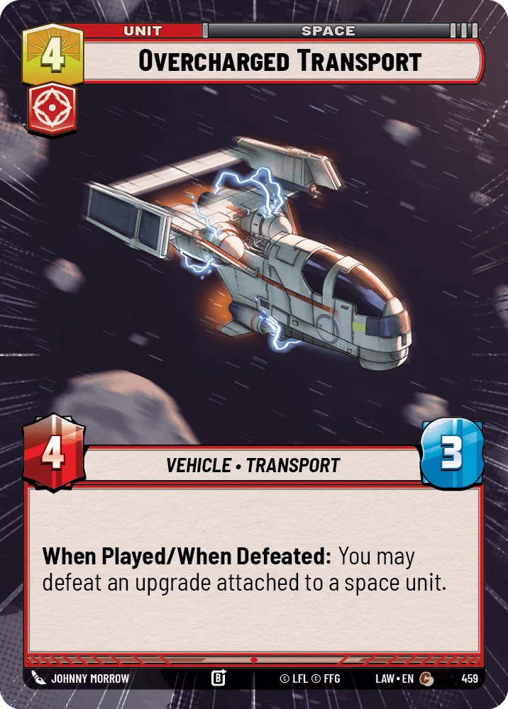 When Played/When Defeated: You may defeat an upgrade attached to a space unit.