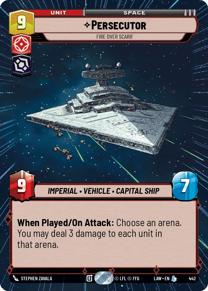 When Played/On Attack: Choose an arena. You may deal 3 damage to each unit in that arena.