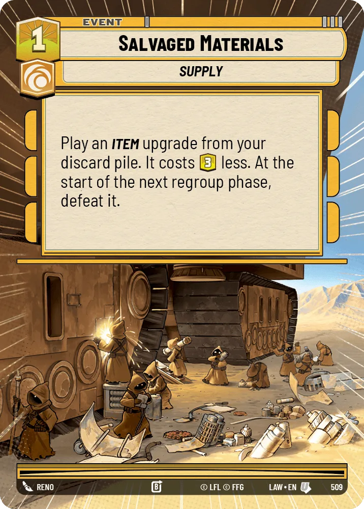 Play an Item upgrade from your discard pile. It costs icon_cost_3.png less. At the start of the next regroup phase, defeat it.