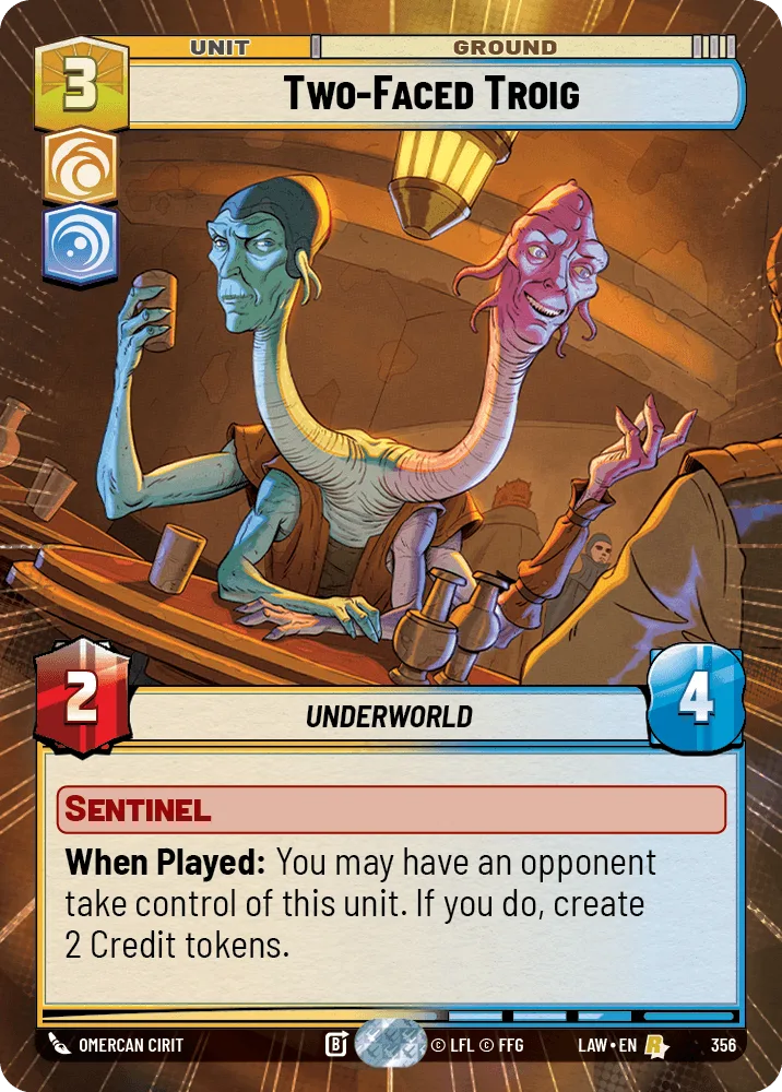 When Played: You may have an opponent take control of this unit. If you do, create 2 Credit tokens.