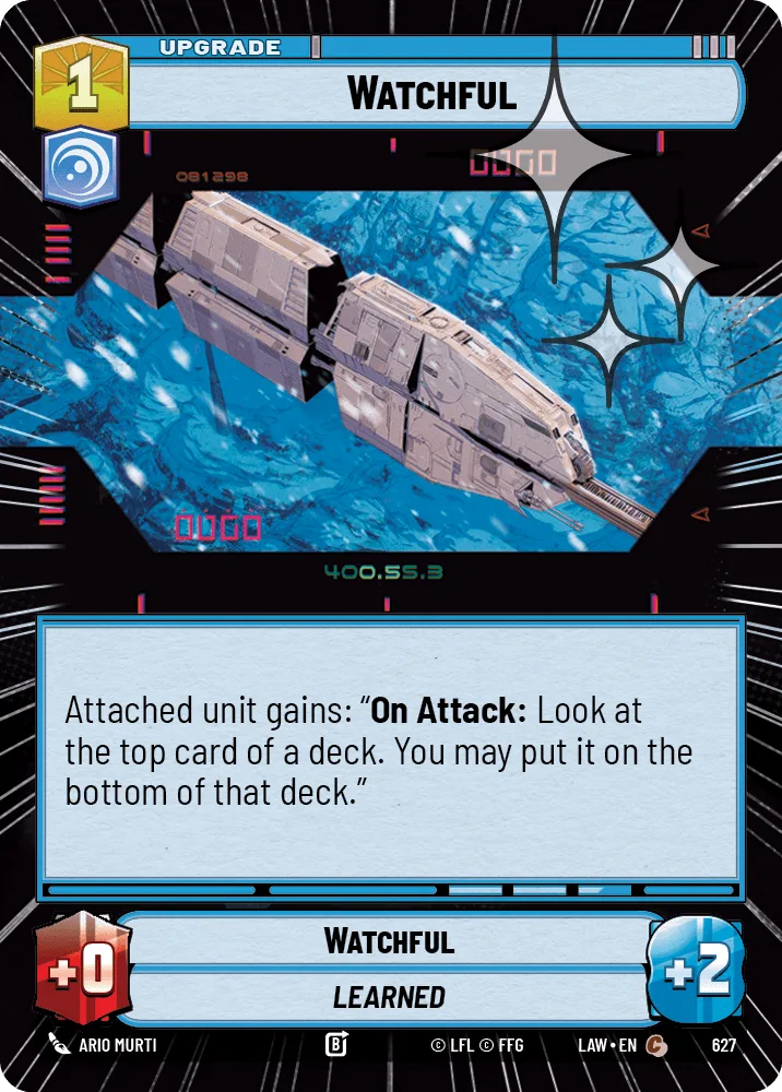 Attached unit gains: “On Attack: Look at the top card of a deck. You may put it on the bottom of that deck. ”