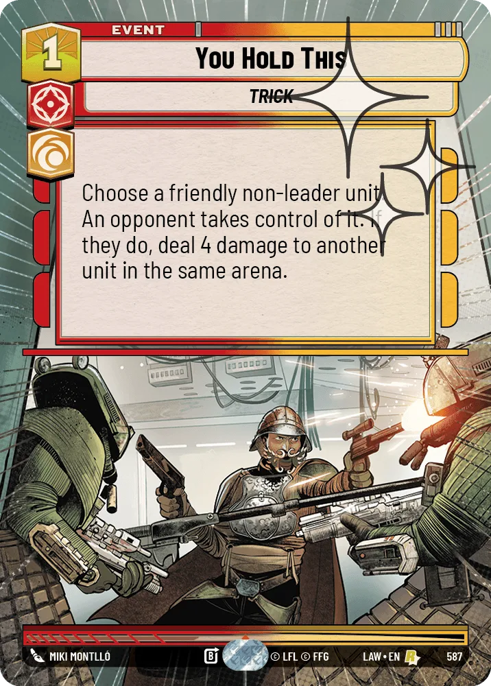 Choose a friendly non-leader unit. An opponent takes control of it. If they do, deal 4 damage to another unit in the same arena.