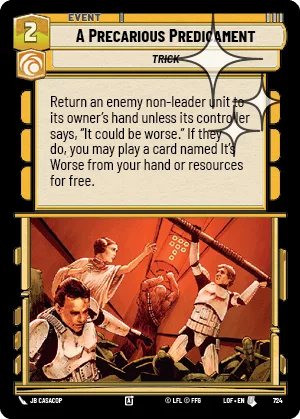 Return an enemy non-leader unit to its owner's hand unless its controller says, “It could be worse.” If they do, you may play a card named It's Worse from your hand or resources for free.