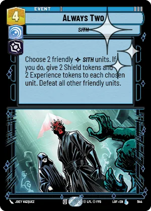 Sith units. If you do, give 2 Shield tokens and 2 Experience tokens to each chosen unit. Defeat all other friendly units.
