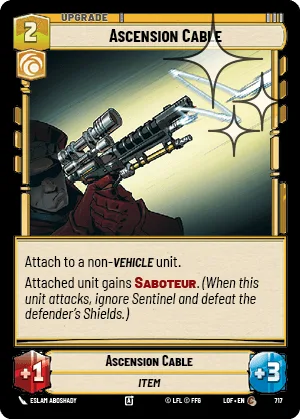 Attached unit gains Saboteur. (When this unit attacks, ignore Sentinel and defeat the defender's Shields.)