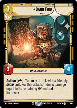 ]: You may attack with a friendly Droid unit. For this attack, it deals damage equal to its remaining HP instead of its power.