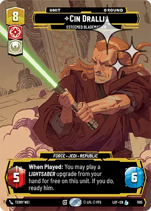 When Played: You may play a Lightsaber upgrade from your hand for free on this unit. If you do, ready him.
