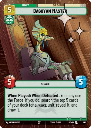 When Played/When Defeated: You may use the Force . If you do, search the top 5 cards of your deck for a Force unit, reveal it, and draw it.