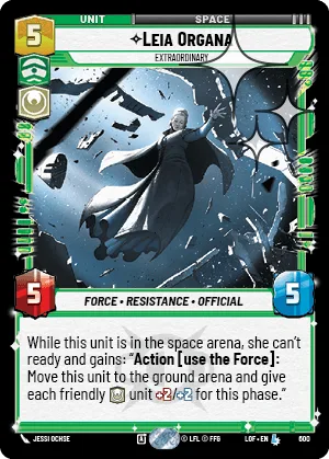 While this unit is in the space arena, she can't ready and gains: “Action [use the Force]: Move this unit to the ground arena and give each friendly