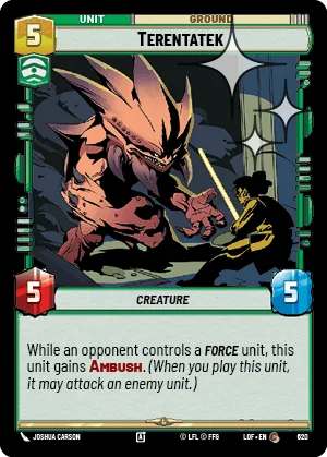 While an opponent controls a Force unit, this unit gains Ambush. (When you play this unit, it may attack an enemy unit.)