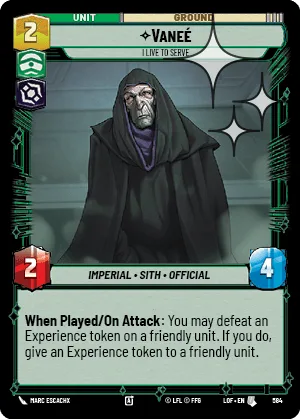 When Played/On Attack: You may defeat an Experience token on a friendly unit. If you do, give an Experience token to a friendly unit.