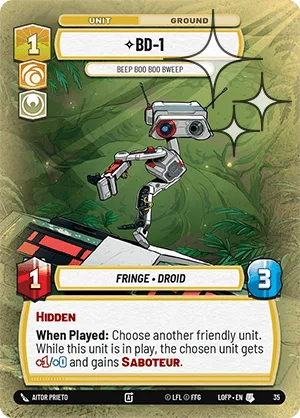 When Played: Choose another friendly unit. While this unit is in play, the chosen unit gets +1/+0 and gains Saboteur.