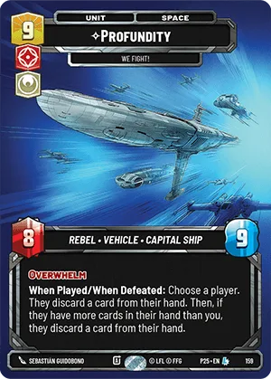 When Played/When Defeated: Choose a player. They discard a card from their hand. Then, if they have more cards in their hand than you, they discard a card from their hand.