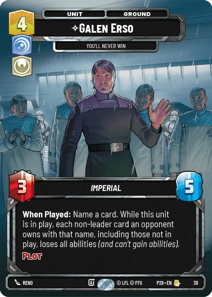 When Played: Name a card. While this unit is in play, each non-leader card an opponent owns with that name, including those not in play, loses all abilities .