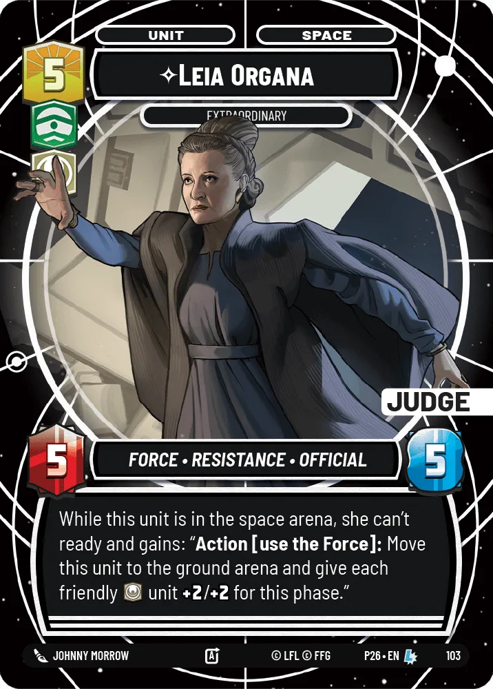 While this unit is in the space arena, she can't ready and gains: “Action [use the Force]: Move this unit to the ground arena and give each friendly