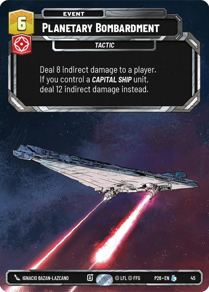 Deal 8 indirect damage to a player. If you control a Capital Ship unit, deal 12 indirect damage instead.