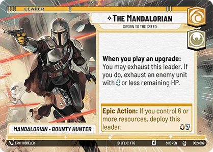 When you play an upgrade: You may exhaust this leader. If you do, exhaust an enemy unit with 4 or less remaining HP.