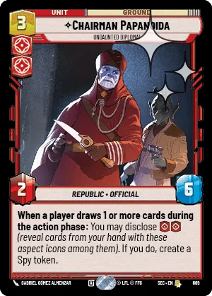 (reveal cards from your hand with these aspect icons among them). If you do, create a Spy token.