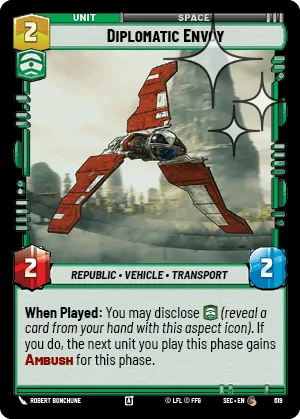 (reveal a card from your hand with this aspect icon). If you do, the next unit you play this phase gains Ambush for this phase.