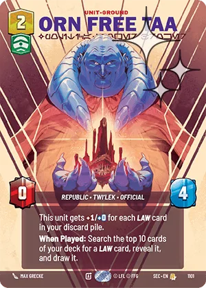 When Played: Search the top 10 cards of your deck for a Law card, reveal it, and draw it.