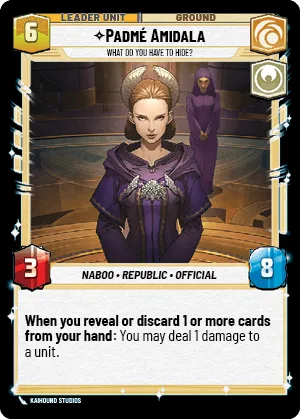 When you reveal or discard 1 or more cards from your hand: You may exhaust this leader. If you do, deal 1 damage to a unit.