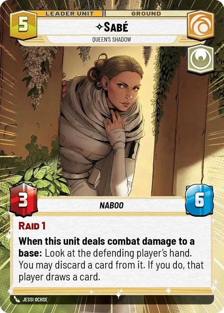 When a friendly unit deals combat damage to a base: You may exhaust this leader. If you do, look at the top 2 cards of the defending player's deck. Discard 1 of those cards.
