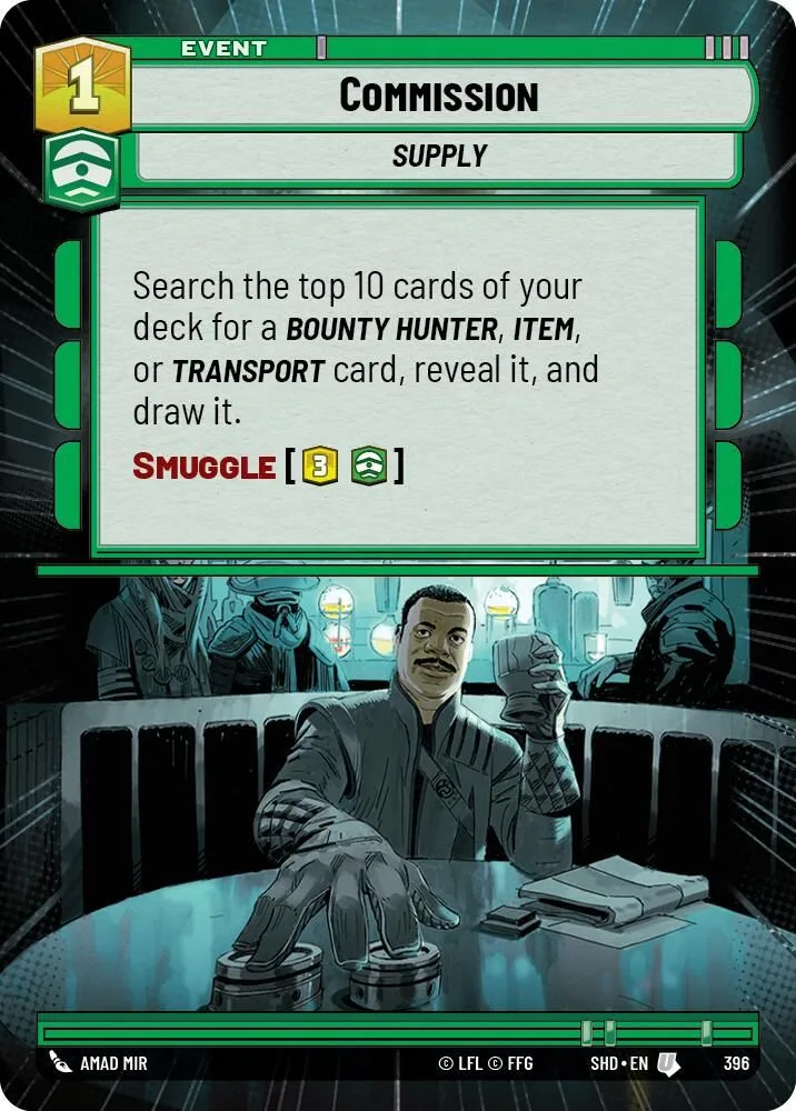 Search the top 10 cards of your deck for a Bounty Hunter, Item, or Transport card, reveal it, and draw it.