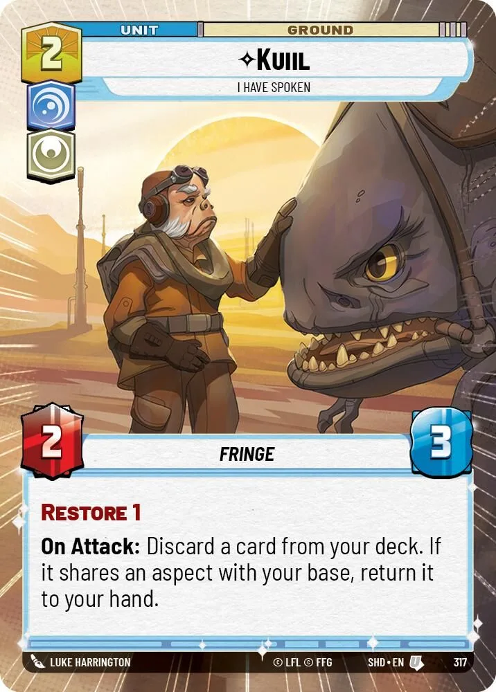On Attack: Discard a card from your deck. If it shares an aspect with your base, return it to your hand.